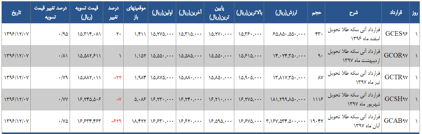 بهای سکه در قرارداد تحویل شهریور سال آینده یک میلیون و 624 هزار تومان معامله شد که در مقایسه با قیمت روز گذشته 0.55 درصد افزایش داشت. همچنین در قرارداد آبان ماه سال ۹۷ نیز معامله گران شاهد ثبت سکه یک میلیون و 620 هزار تومانی بر تابلوی معاملات بودند. قیمت سکه در این سرررسید نیز نسبت به روز قبل 2.05 درصد کاهش داشت.