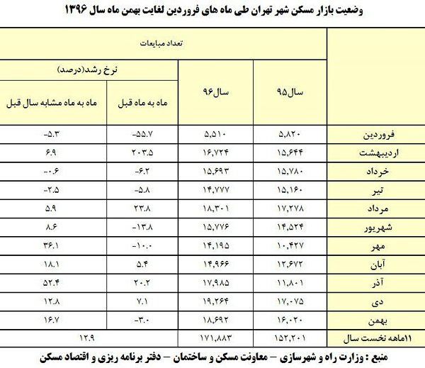 بر اساس اعلام دفتر برنامه ریزی و اقتصاد مسکن وزارت راه و شهرسازی میزان افزایش خرید و فروش مسکن در شهر تهران در مجموع ۱۱ ماه، رشد حدودا ۱۳ درصدی داشته و افزایش قیمت مسکن نیز رشد ۹.۴ درصدی را نسبت به ۱۱ ماه سال گذشته نشان می دهد.