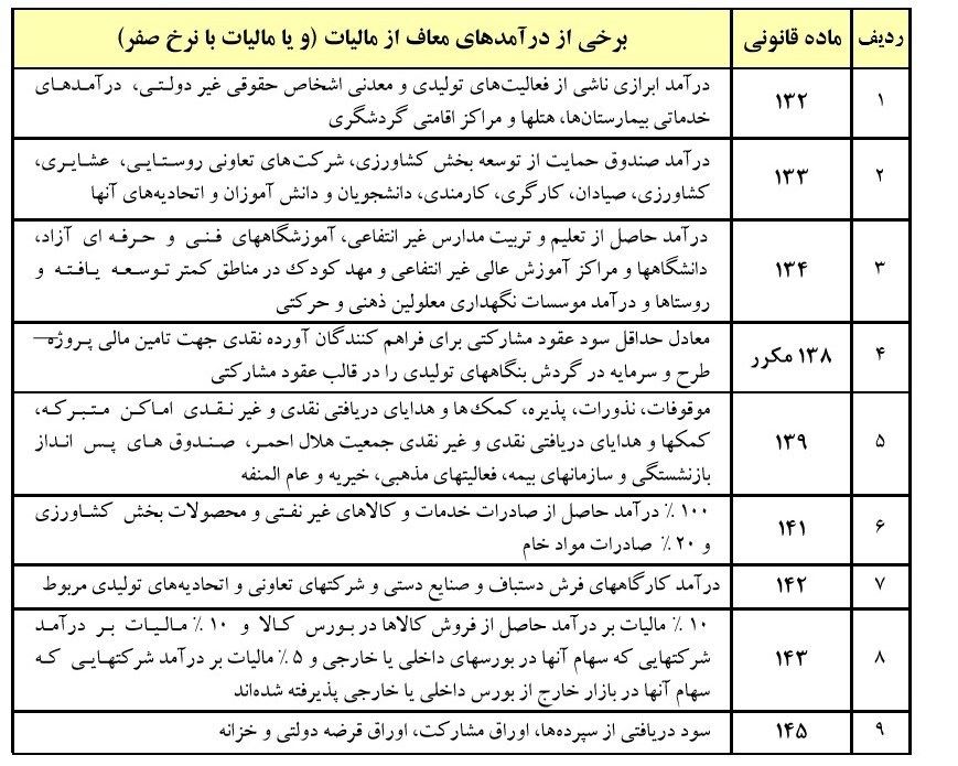 بر اساس ماده 141 قانون مالیاتهای مستقیم، 100 درصد درامد حاصل از صادرات خدمات و کالاهای غیر نفتی و محصولات کشاورزی و 20 درصد صادرات مواد خام از مالیات معاف می‌باشد. همچنین ماده 138 مکرر قانون مالیاتهای مستقیم معادل حداقل سود عقود مشارکت برای فراهم کنندگان آورده نقدی جهت تامین مالی پروژه و سرمایه در گردش واحدهای تولیدی معاف از مالیات است.