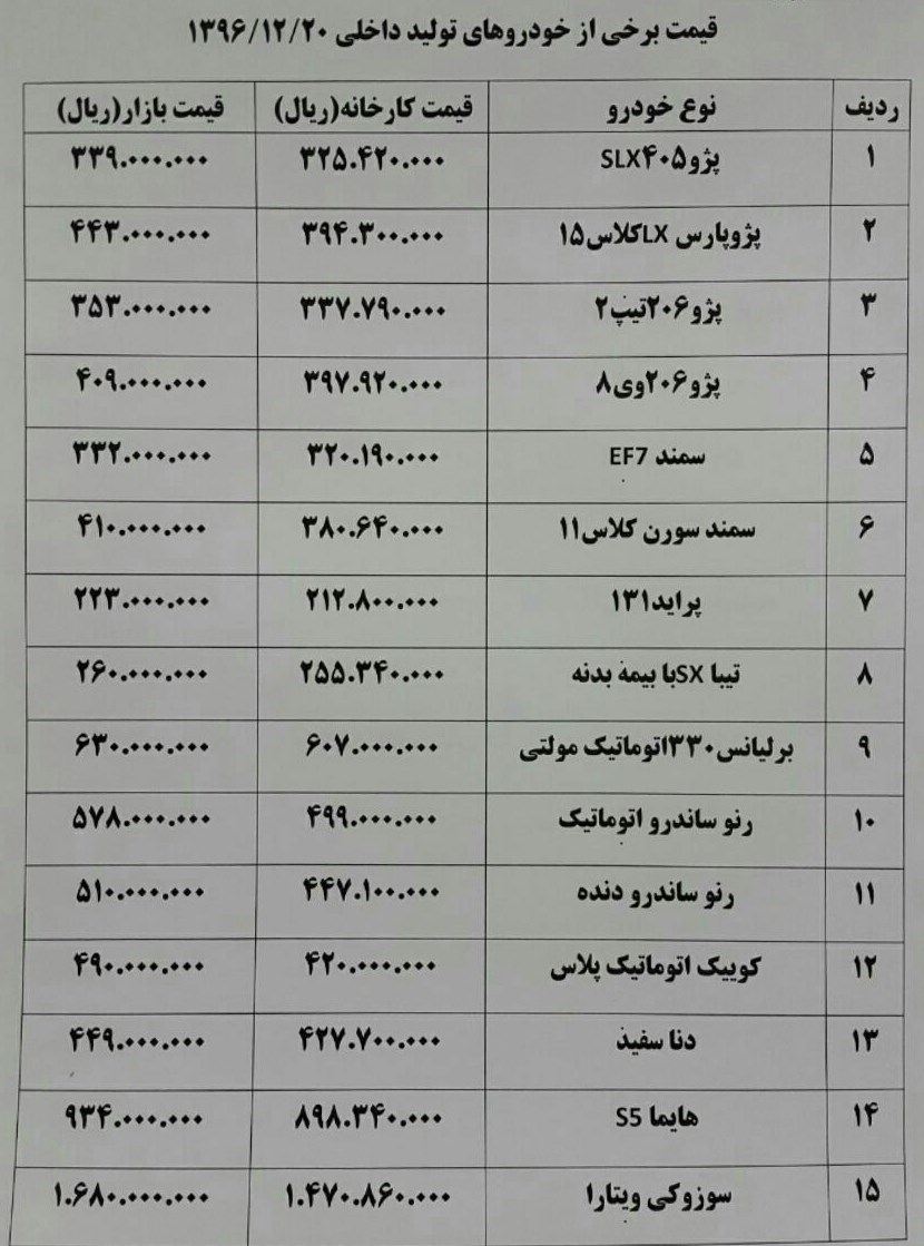 پژو405 GLX با افزایش 400 هزار تومانی با قیمت 32 میلیون و 200 هزار تومان، پژو پارس با کاهش 200 هزار تومانی با قیمت 40 میلیون و 300 هزار تومان، سمند LX با افزایش 400 هزار تومانی با قیمت 35 میلیون تومان و سمند EF7 با کاهش 500 هزار تومانی با قیمت 33 میلیون و 200 هزار تومان در بازار مورد معامله قرار میگیرد.