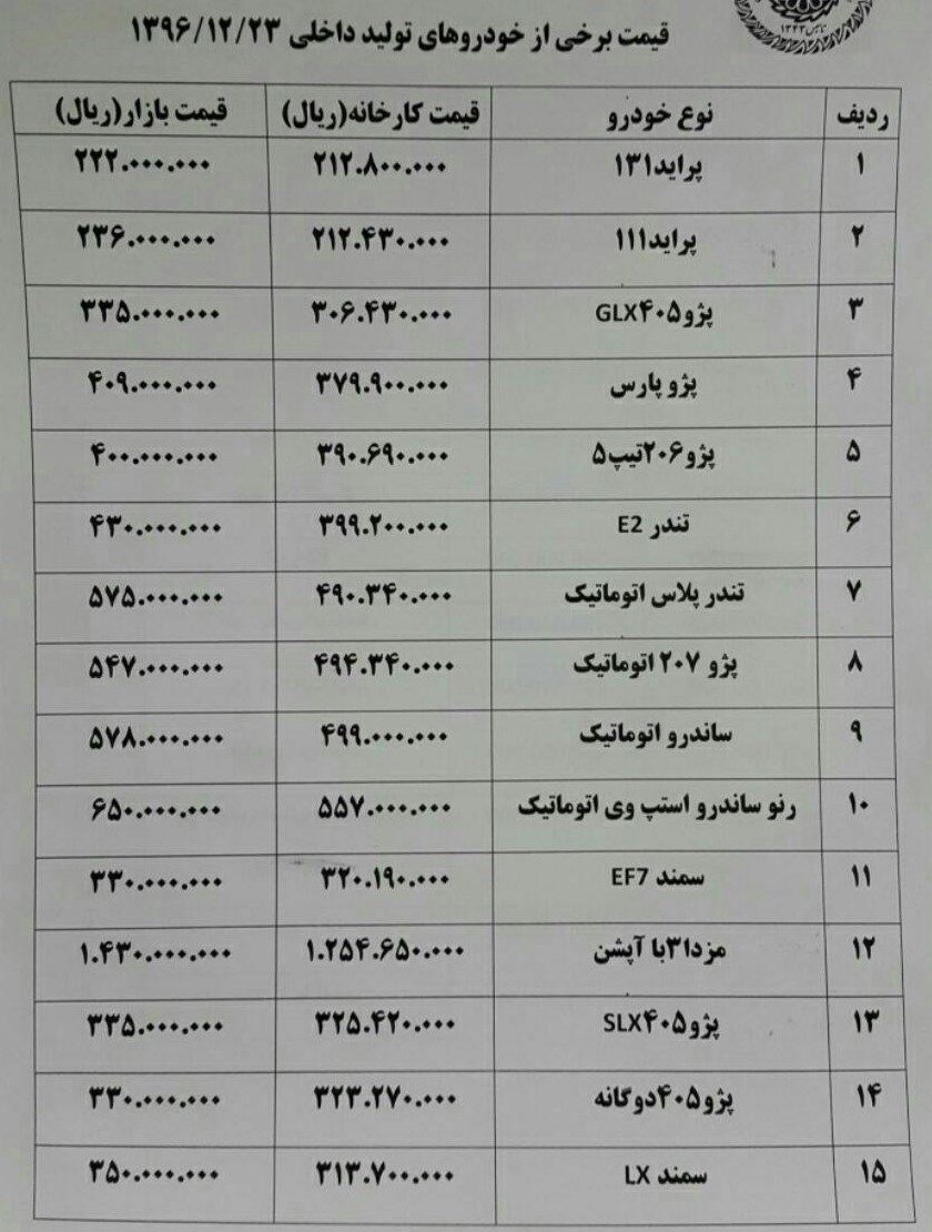 قیمت تعدادی از خودروهای داخلی در بازار امروز به شرح زیر است: