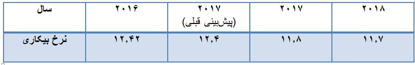 نرخ بیکاری در سال 2016 برابر با 12.42 درصد بوده است، بنابراین نرخ بیکاری ایران کاهش یافته است و پیشبینی میشود که در سال 2018 به 11.7 درصد برسد.