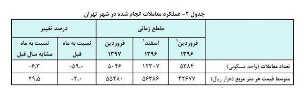 بانک مرکزی امروز گزارش تحولات بازارمسکن شهر تهران را اعلام کرد که طی آن مشخص شد در فروردین ماه ۱۳۹۷ تعداد معاملات شهر تهران به ۵۰۰۰ واحد مسکونی رسید که نسبت به ماه قبل و ماه مشابه سال قبل به ترتیب ۵۹ و ۶.۳ درصد کاهش نشان می دهد.