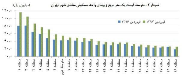 بالاترین قیمت مربوط به منطقه ۱ با متوسط هر متر مربع ۱۱ میلیون و ۶۴۰ هزار تومان بوده است. پایین ترین میانگین قیمت نیز به منطقه ۱۸ با متری ۲ میلیون و ۶۴۰ هزار تومان مربوط می شود.