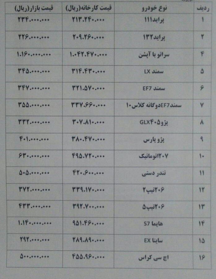 قیمت تعدادی از خودروهای داخلی در بازار امروز به شرح زیر است:
