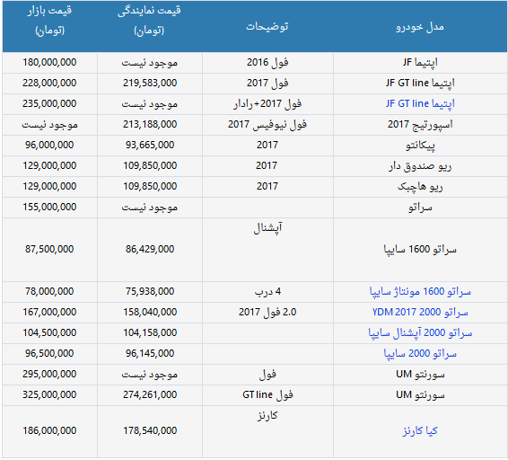 قیمت انواع محصولات گروه کیا در نمایندگی و بازار به شرح زیر میباشد :