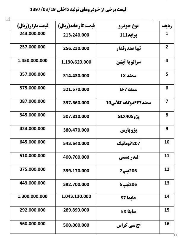 قیمت تعدادی از خودروهای داخلی در بازار امروز به شرح زیر است: