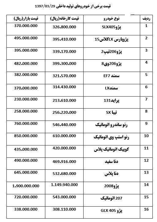 قیمت تعدادی از خودروهای داخلی در بازار امروز به شرح زیر است: