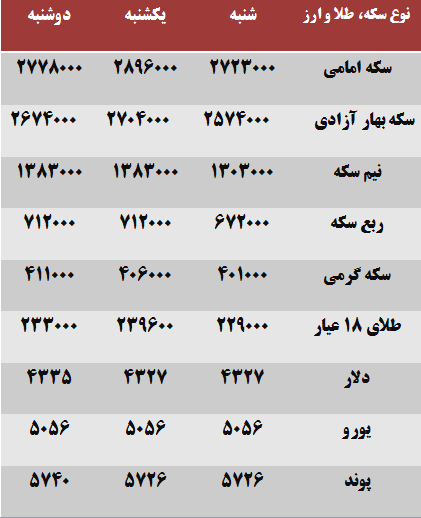 از سویی دیگر، امروز در بازار آزاد هر قطعه نیم سکه بهار آزادی بدون تغییر قیمت نسبت به روز گذشته یک میلیون و ۳۸۳ هزار تومان و هر قطعه ربع بهار آزادی نیز بدون تغییر به ارزش ۷۱۲ هزار تومان معامله شد. بر اساس این گزارش، هر قطعه سکه گرمی با ۵ هزار تومان رشد به قیمت ۴۱۱ هزار تومان معامله شد و قیمت هر گرم طلای ۱۸ عیار نیز با افت ۶ هزار و ۶۰۰ تومانی به ارزش ۲۳۳ هزار تومان فروخته شد.
