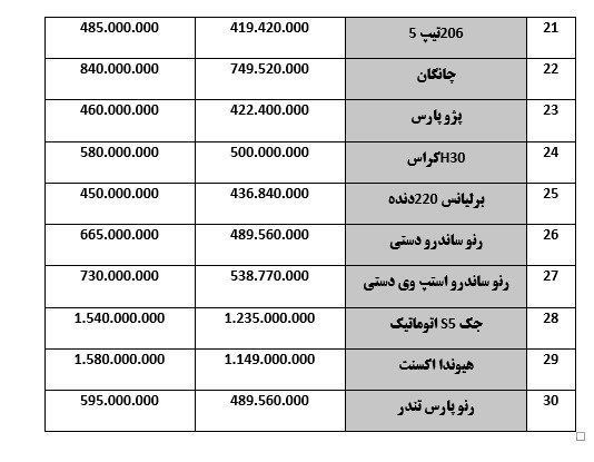 همچنین هایما s7 هم با کاهش 500 هزار تومانی با قیمت 144 میلیون تومان و پژو206 تیپ 5 با افزایش 300 هزار تومانی با قیمت 48 میلیون و 500 هزار تومان مورد معامله قرار میگیرد.