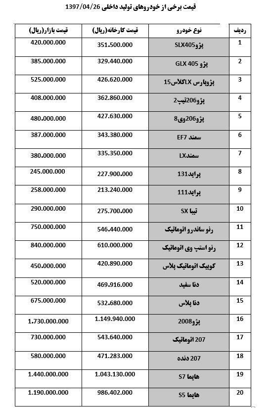 قیمت خودرو در بازار امروز بهشرح زیر است: