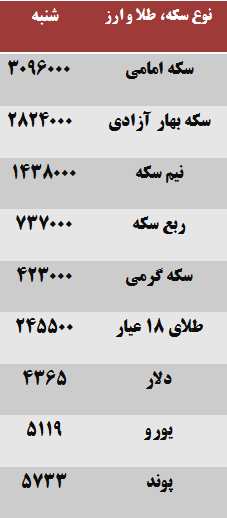 همچنین هر قطعه سکه تمام بهار آزادی طرح قدیم با ۱۳۰ هزار تومان رشد نسبت به روز پنج شنبه به ارزش ۲ میلیون و ۸۲۴ هزار تومان داد و ستد شد. از سویی دیگر، امروز در بازار آزاد هر قطعه نیم سکه بهار آزادی با ۶۰ هزار تومان افزایش قیمت نسبت به پنج شنبه گذشته یک میلیون و ۴۳۸ هزار و هر قطعه ربع بهار آزادی نیز با ۲۰ هزار تومان رشد در مدت مشابه به ارزش ۷۳۷ هزار تومان معامله شد.
