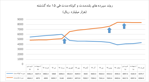 در 15 ماه گذشته دو عامل توانسته اند سه بار باعث تاثیرگذاری بر روند سپرده های بلندمدت و کوتاه مدت شوند. یک عامل توانسته است دو بار سپرده ها را به سمت حساب های بلندمدت سوق دهد و یک عامل نیز باعث سوق دادن سپرده ها به سمت حساب های کوتاه مدت شده است. نمودار زیر روند سپرده های کوتاه مدت و بلندمدت را در یک سال اخیر نشان می دهد.