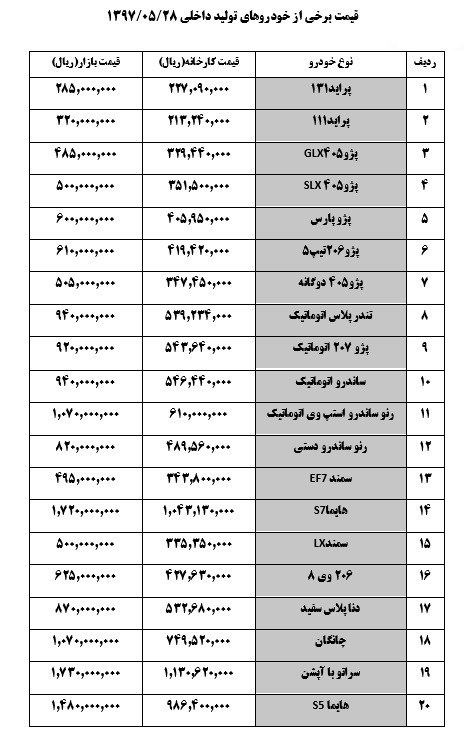 قیمت تعدادی از خودروهای داخلی در بازار امروز به شرح زیر است:
