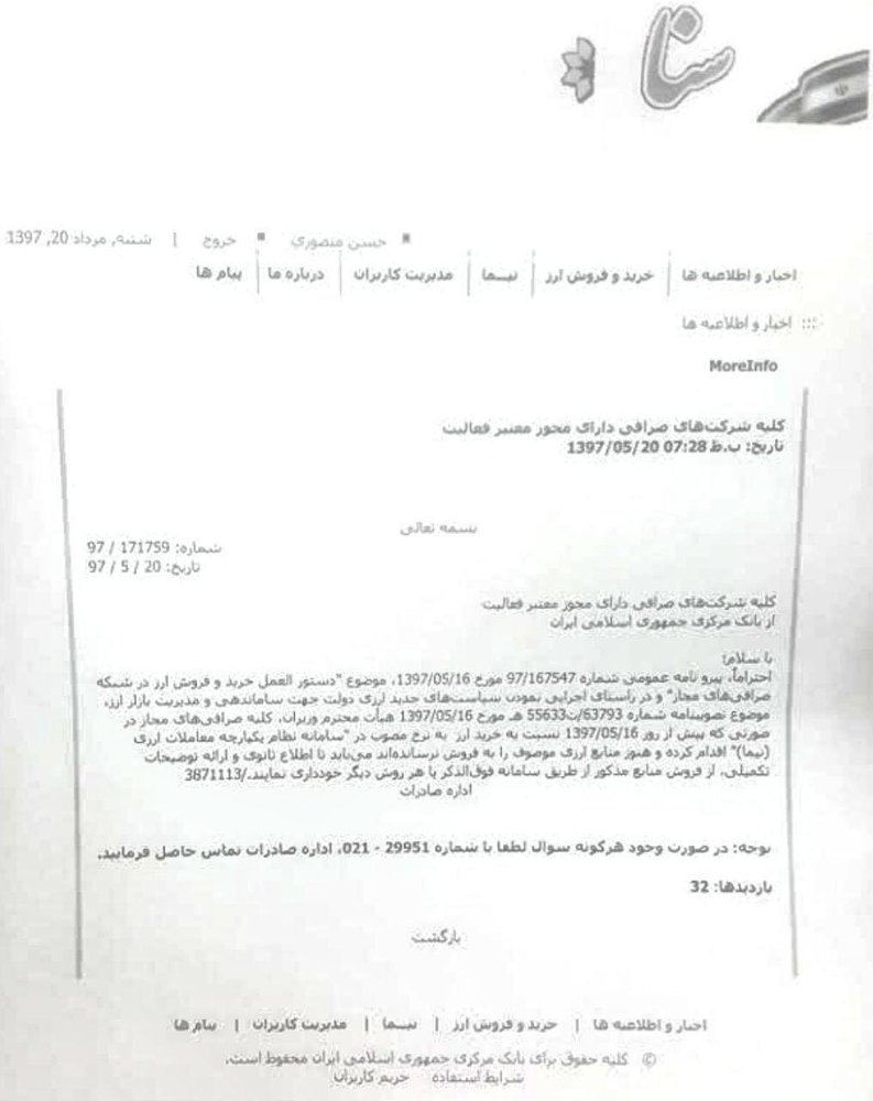 با سلام. احتراما پیرو نامه عمومی شماره ۹۷/۱۶۷۵۴۷ مورخ ۹۷/۵/۱۶ موضوع دستورالعمل خرید و فروش ارز در شبکه صرافیهای مجاز و در راستای اجرایی نمودن سیاستهای جدید ارزی دولت جهت ساماندهی و مدیریت بازار ارز، موضوع تصویب نامه شماره ۶۳۷۹۳/ت ۵۵۶۳۳ ه مورخ ۹۷/۵/۱۶هیات محترم وزیران، کلیه صرافیهای مجاز در صورتی که پیش از روز شانزدهم مرداد نسبت به خرید ارز به نرخ مصوب در سامانه نظام یکپارچه مدیریت ارز(نیما) اقدام کرده و هنوز آنرا به فروش نرساندهاند، می بایست تا اطلاع ثانوی و ارایه توضیحات تکمیلی از فروش منابع مذکور از طریق سامانه فوقالذکر با هر روش دیگری خودداری نمایند.