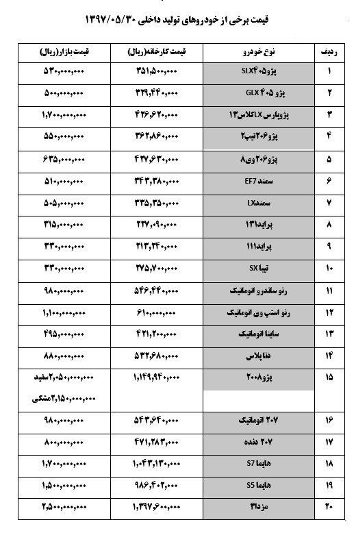 قیمت تعدادی از خودروهای داخلی در بازار امروز به شرح زیراست: