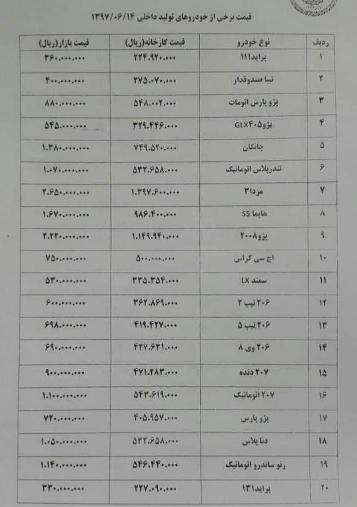 قیمت خودرو امروز ۱۳۹۷/۰۶/۱۴