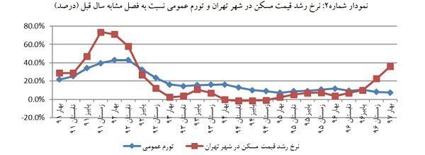 مقایسه نرخ رشد قیمت مسکن با تورم عمومی نشان می دهد که این شاخص (نرخ رشد قیمت مسکن) از سال ۹۲ تا ۹۵ همواره از تورم عمومی عقبتر بوده است؛ به نحوی که در سال ۹۵ این دو شاخص به یکدیگر نزدیک شدند؛ اما از سال ۹۶، نرخ رشد قیمت مسکن از نرخ تورم عمومی پیشی می گیرد که در نهایت، در بهار امسال بین این دو شاخص شکاف گسترده تری به وجود می آید.