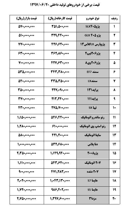 براساس معاملات امروز خودرو سمند ال ایکس با ثبات قیمت 54 میلیون تومان، سمند EF7 با کاهش یک میلیون تومانی با قیمت 53 میلیون و 500 هزار تومان، پژو206 تیپ 2 با افزایش 2 میلیون تومانی با قیمت 63 میلیون تومان، پژو206 صندوقدار با افزایش 2میلیون تومانی با قیمت 70 میلیون تومان و استپ وی با افزایش 2 میلیون تومانی با قیمت 128 میلیون تومان و ساندرو اتوماتیک با افزایش 2 میلیون تومانی با قیمت 115 میلیون تومان به فروش میرسد.