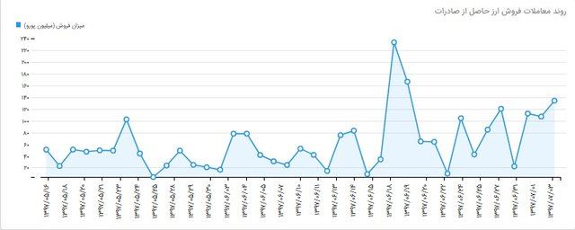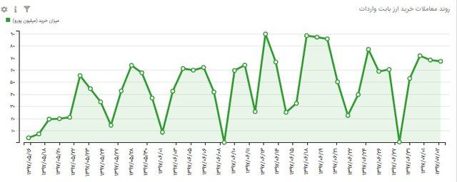 همچنین بررسی روند فروش ارز حاصل از صادرات از نیمه مردادماه تاکنون نشان دهنده آن است که بالاترین حد فروش به فاصله زمانی بین ۱۵ تا ۲۰ شهریور ماه بر می‌گردد که در یک روز بیش از ۲۳۰ میلیون یورو فروش انجام شده و در بقیه روزها حداکثر فروش تا ۱۴۰ میلیون یورو بوده است. اما در مقابل عرضه‌ای که صادرکنندگان داشته‌اند، حجم خرید واردکنندگان پایین‌تر بوده؛ به طوری‌که حداکثر مبلغ خریداری شده در یک روز تا ۹۰ میلیون یورو ثبت شده که مربوط به فاصله ۱۲ تا ۱۴ شهریور ماه و همچنین ۱۸ تا ۲۰ همین ماه است.