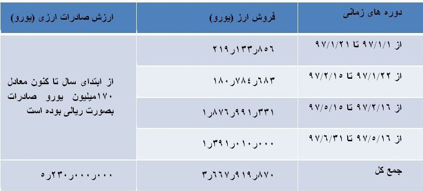 به عبارت دیگر مروری بر وضعیت عرضه ارز حاصل از صادرات پتروشیمی نشان می دهد، که شرکتهای پتروشیمی درحد فاصل اول تا 21 فروردین ماه و قبل از مصوبه 22 فروردین هیأت دولت بیش از 220 میلیون یورو با قیمت تکلیفی 4200 تومان عرضه کرده اند.