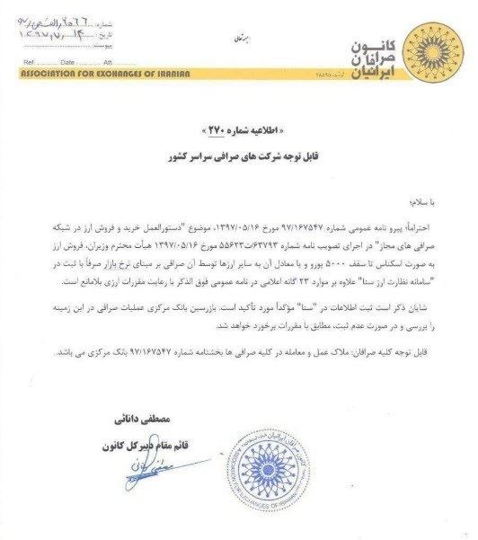 احتراما پیرو نامه عمومی شماره 97٫167547 مورخ 16 مرداد 1397، موضوع "دستور العمل خرید و فروش ارز در شبکه صرافی های مجاز" در اجرای تصویب نامه شماره 63793/ت 55623 مورخ 16 مردادماه 1397 هیأت محترم وزیران، فروش ارز به صورت اسکناس تا سقف 5000 یورو و یا معادل آن به سایر ارزها توسط آن صرافی بر مبنای نرخ بازار صرفا با ثبت در "سامانه نظارت ارز سنا" علاوه بر موارد 23 گانه اعلامی در نامه عمومی فوق الذکر با رعایت مقررات ارزی بلامانع است.
