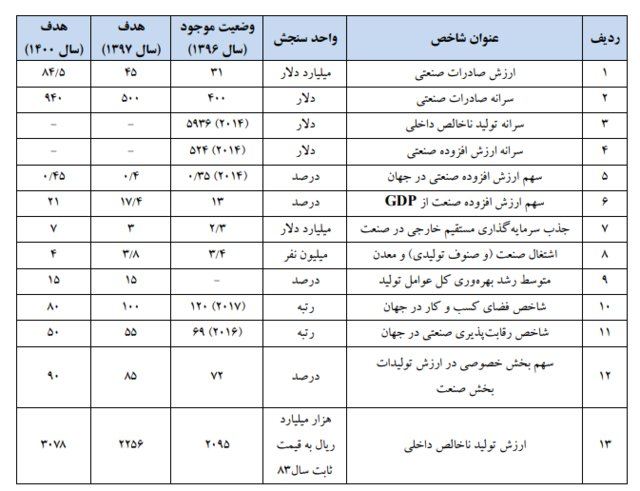 جدول مربوط به اهداف کمی بخش صنعت، در سال ۱۳۹۷ و سال ۱۴۰۰ و نیز وضعیت سال گذشته که به صورت اختصاصی در اختیار ایسنا قرار گرفته، در ذیل آمده است.