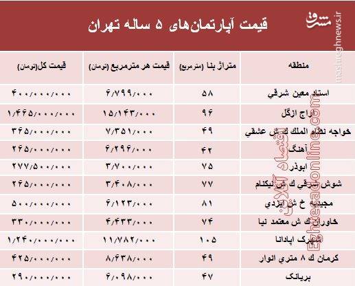 جدول/ قیمت آپارتمانهای ۵ ساله تهران آنچه در زیر میآید جدول قیمت معاملات انجام شده آپارتمانهایی با عمر بنای ۵ سال در مناطق ۲۲گانه شهری تهران طی آبان ماه ۹۷ است. تاریخ: ۱۵/آبان/۹۷ ساعت ۱۱:۱۰ | سرگرمی شناسه خبر: ۴۸۷۶۱ منبع: مشرق نیوز خبر را برای من بخوان