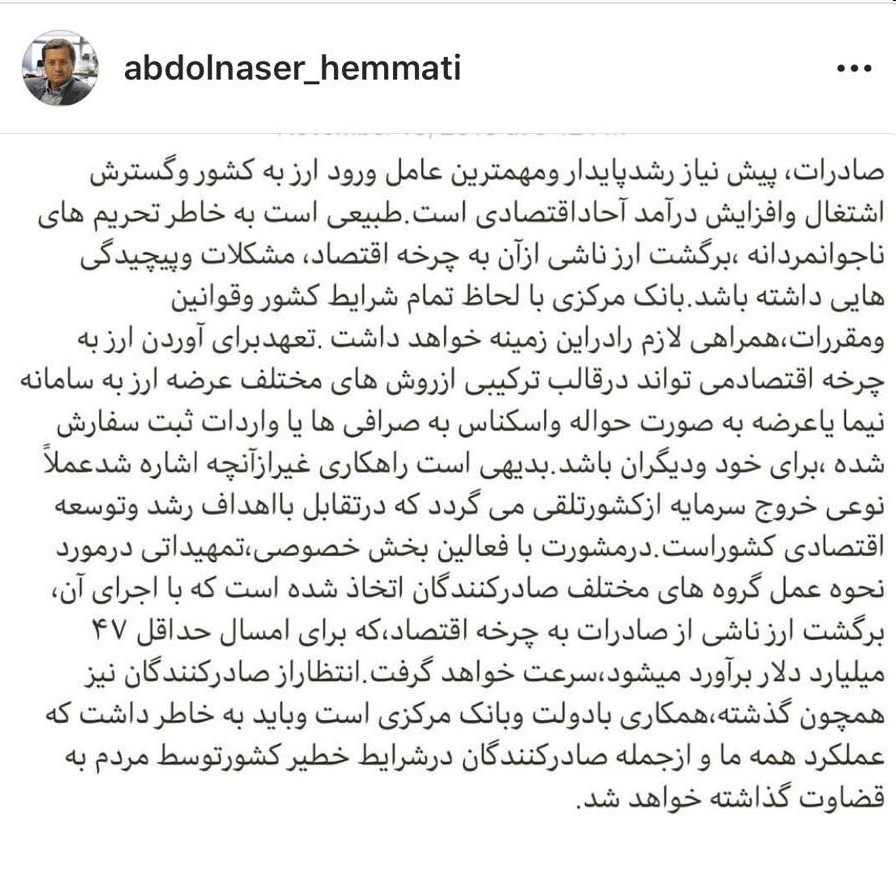 متن پیام بهشرح زیر است: "یکی از دغدغههای بانک مرکزی در ماههای اخیر برای ساماندهی بازار ارز و پاسخگویی به نیازهای طبیعی مردم، راهاندازی یک بازار متشکل ارزی برای معامله آزاد، اعم از نقد و حواله اسعار بین المللی توسط کارگزاران (بانکها و صرافیهای مجاز) بوده است. جلسات متعددی با حضور کارشناسان و صاحبنظران بازار ارز و سرمایه و خصوصاً بانکها و صرافیها در بانک مرکزی تشکیل و ابعاد مختلف موضوع بررسی شد.