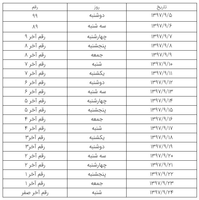 جدول زمانبندی مراجعه به سامانه خدمات دولت همراه براساس رقم سمت راست شماره تلفن همراه: