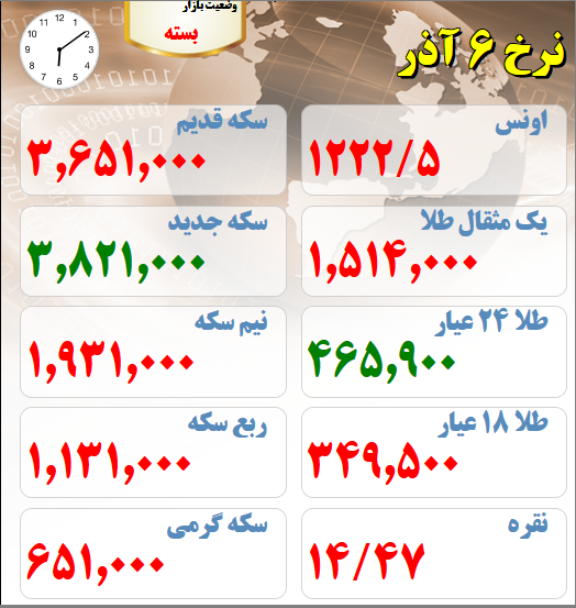 آخرین نرخ های بازار طلا و سکه ادامه روند کاهشی قیمت طلا و سکه تاریخ: ۶/آذر/۹۷ ساعت ۱۸:۱۸ | اقتصاد ایران شناسه خبر: ۴۹۰۴۵ منبع: سایت طلا خبر را برای من بخوان بازار کاهشی طلا و سکه در آخرین ساعات بازار امروز 6 آذر ماه :