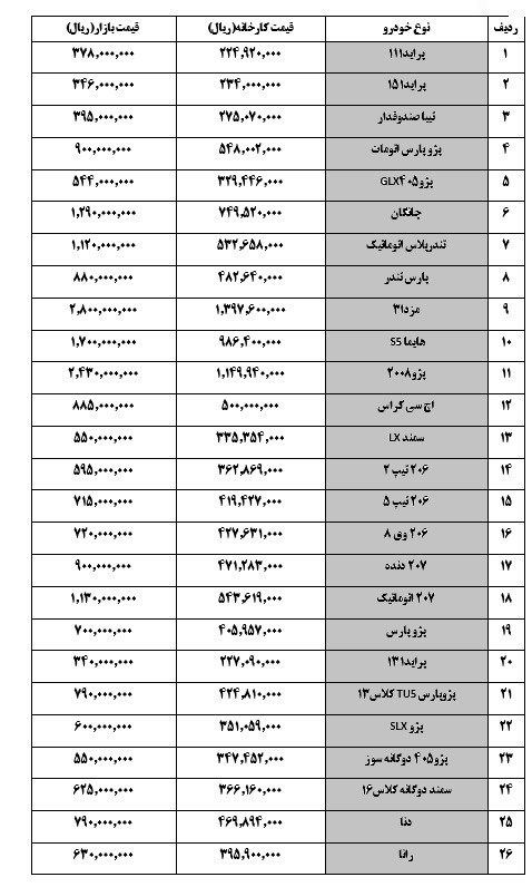 پژو ۲۰۶ صندوق‌دار با قیمت ۷۲ میلیون تومان، پراید ۱۵۱ با قیمت ۳۴ میلیون و ۶۰۰ هزار تومان و پژوپارس TU۵ با قیمت ۷۹ میلیون تومان به فروش می‌رسد.