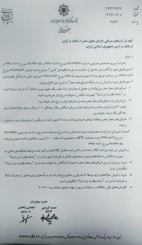 صرافیهای مجاز معتبر میتوانند ارز حاصل از صادرات را تا سقف یک میلیون یورو یا معادل آن به سایر ارزها با ثبت در "سامانه نظارت ارز (سنا)" به صورت اسکناس یا حواله به نرخ بازار خریداری کنند.