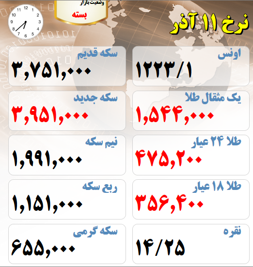 آخرین نرخ های بازار طلا و سکه افزایش قیمت طلا و سکه در آخرین ساعات امروز 11آذر ماه تاریخ: ۱۱/آذر/۹۷ ساعت ۱۸:۴۶ | اقتصاد ایران شناسه خبر: ۴۹۱۳۸ منبع: سایت طلا خبر را برای من بخوان افزایش قیمت طلا و سکه در آخرین ساعات امروز 11آذر ماه