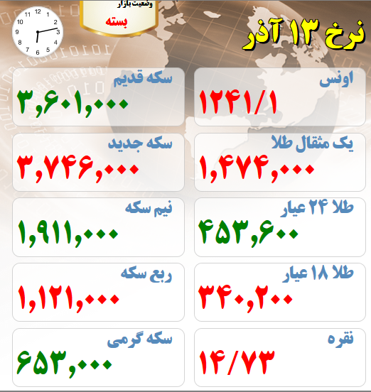 آخرین نرخ های بازار طلا و سکه 13 آذر ماه
