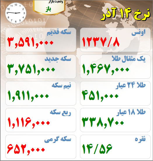 قیمت های بازار طلا و سکه نیمروز 14 آذر ماه امامی 3میلیون و هفتصدو پنجاه هزارتومان| 18 عیار سیصدو سی و هشت هزار تومان تاریخ: ۱۴/آذر/۹۷ ساعت ۱۴:۵۵ | اقتصاد ایران شناسه خبر: ۴۹۲۵۸ منبع: سایت طلا خبر را برای من بخوان قیمت های بازار طلا و سکه نیمروز 14 آذر ماه : (لحظه تنظیم خبر)