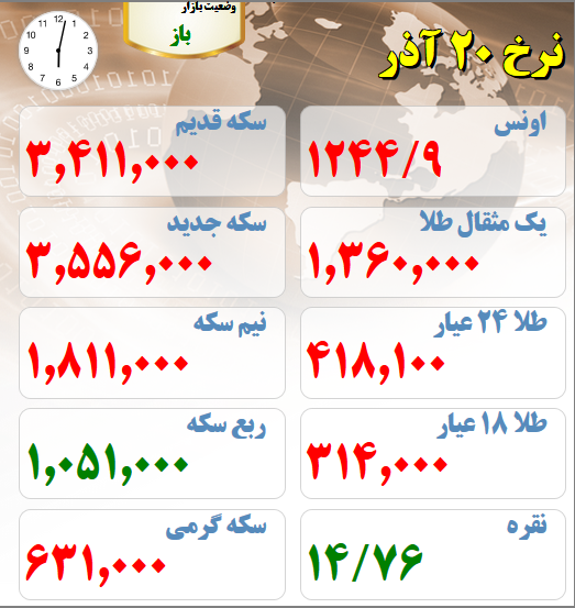 آخرین قیمت های بازار طلا و سکه20 آذر ماه قیمت های طلا و سکه بازار تهران تاریخ: ۲۰/آذر/۹۷ ساعت ۱۸:۰۰ | اقتصاد ایران شناسه خبر: ۴۹۴۸۲ منبع: سایت طلا خبر را برای من بخوان آخرین قیمت های بازار طلا و سکه 20 آذر ماه :