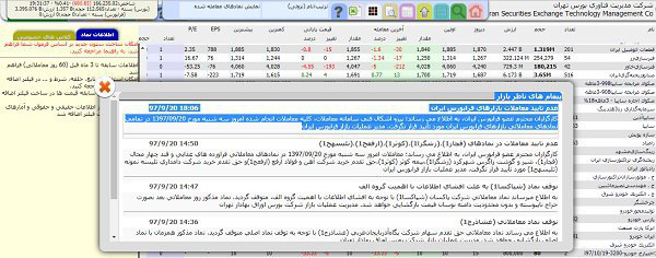 عدم تأیید معاملات بازارهای فرابورس ایران: کارگزاران محترم عضو فرابورس ایران، به اطلاع می رساند پیرو اشکال فنی سامانه معاملات، کلیه معاملات انجام شده امروز سه شنبه مورخ ۱۳۹۷/۰۹/۲۰ در تمامی نمادهای معاملاتی بازارهای فرابورس ایران مورد تأیید قرار نگرفت. مدیر عملیات بازار فرابورس ایران