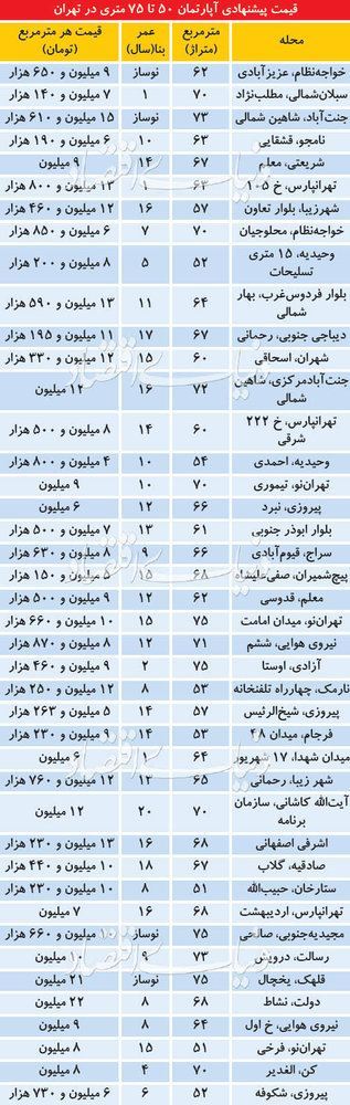 آخرین قیمت آپارتمان های ۵۰ تا ۷۵متری پایتخت