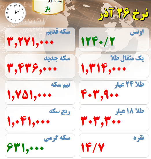 3. قیمت های بازار طلا و سکه نیمروز 26 آذر ماه