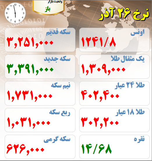آخرین قیمت های بازار طلا و سکه 26 آذر ماه :