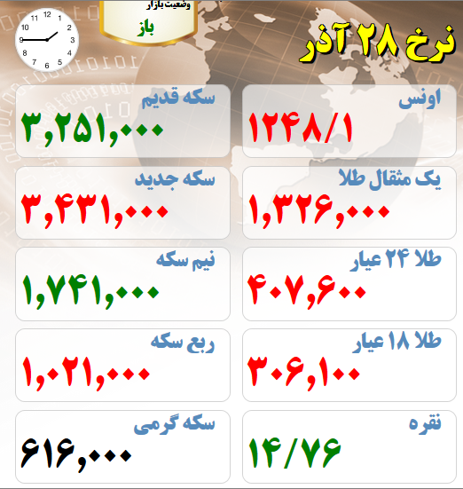 3. قیمت های بازار طلا و سکه نیمروز 28 آذر ماه