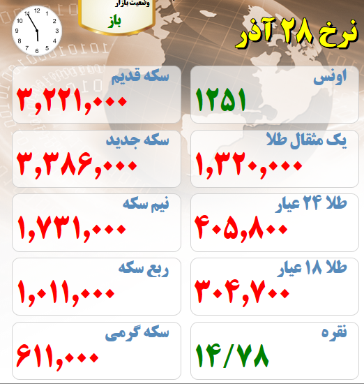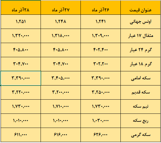 آخرین قیمت های بازار طلا و سکه 28 آذر ماه + جدول مقایسه قیمت های طلا و سکه در بازار تهران تاریخ: ۲۸/آذر/۹۷ ساعت ۱۷:۴۱ | اقتصاد ایران شناسه خبر: ۴۹۷۲۹ منبع: سایت طلا خبر را برای من بخوان آخرین قیمت های بازار طلا و سکه 28 آذر ماه : (لحظه تنظیم خبر)