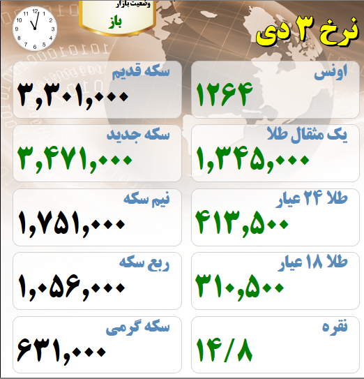 قیمت های بازار طلا و سکه امروز سوم دیماه قیمت های طلا و سکه بازار تهران تاریخ: ۳/دي/۹۷ ساعت ۱۱:۰۸ | اقتصاد ایران شناسه خبر: ۴۹۸۰۴ منبع: سایت طلا خبر را برای من بخوان قیمت های بازار طلا و سکه امروز سوم دیماه : (لحظه تنظیم خبر) برچسب ها : قیمت طلا قیمت سکه طلا و سکه ربع سکه نیم سکه