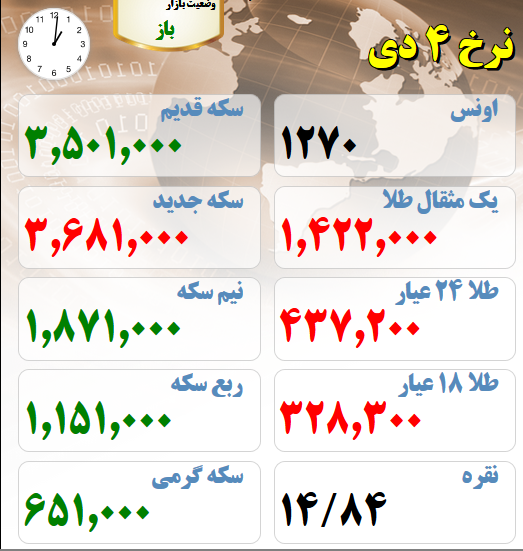 قیمت های بازار طلا و سکه نیمروز چهارم دی ماه افزایش قیمت ها در بازار طلا و سکه تاریخ: ۴/دي/۹۷ ساعت ۱۲:۵۸ | اقتصاد ایران شناسه خبر: ۴۹۸۵۲ منبع: سایت طلا خبر را برای من بخوان قیمت های بازار طلا و سکه نیمروز چهارم دی ماه : (لحظه تنظیم خبر) برچسب ها : قیمت طلا قیمت سکه سکه گرمی ربع سکه نیم سکه