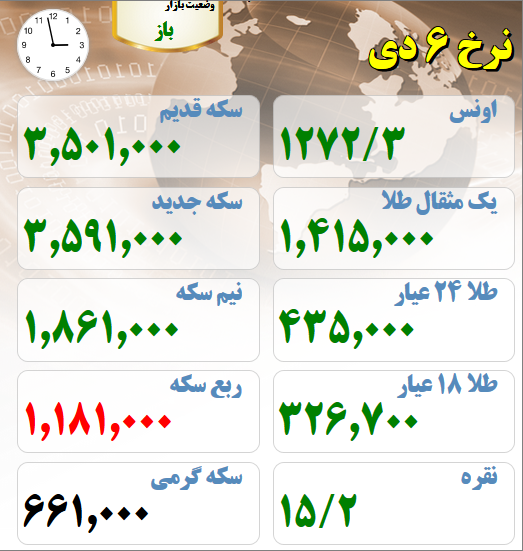 آخرین قیمت های بازار طلا و سکه ششم دیماه | مقایسه با قیمت روز گذشته بازار طلا و سکه امروز هم با کاهش همراه بود تاریخ: ۶/دي/۹۷ ساعت ۱۵:۰۱ | اقتصاد ایران شناسه خبر: ۴۹۹۱۰ منبع: سایت طلا خبر را برای من بخوان آخرین قیمت های بازار طلا و سکه ششم دیماه : (لحظه تنظیم خبر) برچسب ها : قیمت طلا قیمت سکه سکه بهار آزادی سکه امامی