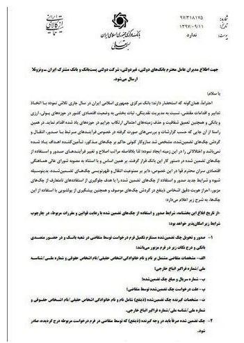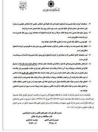 در این بخشنامه آمده است، دارندگان چک تضمین شده ای که قبل از ابلاغ بخشنامه صادر شده اند حداکثر ظرف مدت یک ماه از تاریخ ابلاغ بخشنامه می توانند وجه آن را نقدا دریافت یا به حساب بانکی خود واریز کنند.