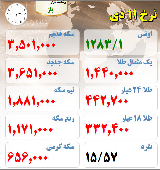 قیمت های بازار طلا و سکه نیمروز یازدهم دیماه :