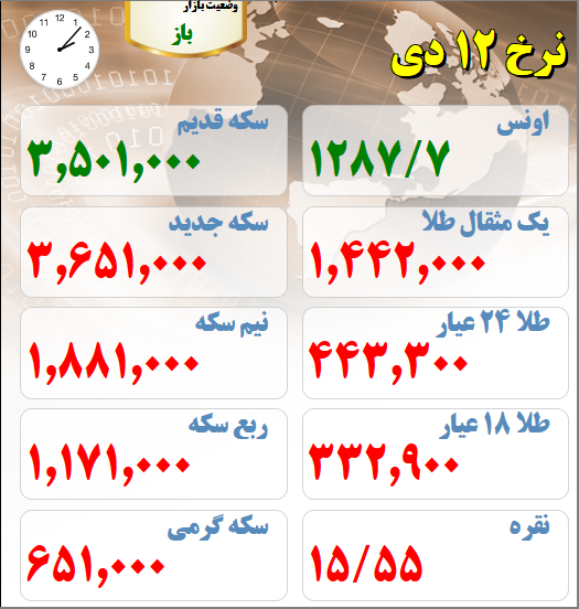 قیمت های بازار طلا و سکه نیمروز دوازدهم دیماه قیمت طلا و سکه در بازار تهران تاریخ: ۱۲/دي/۹۷ ساعت ۱۴:۰۸ | اقتصاد ایران شناسه خبر: ۵۰۰۶۳ خبر را برای من بخوان قیمت های بازار طلا و سکه نیمروز دوازدهم دیماه : (لحظه تنظیم خبر) برچسب ها : نیم سکه قیمت طلا قیمت سکه طلا و سکه سکه امامی هر گرم طلا