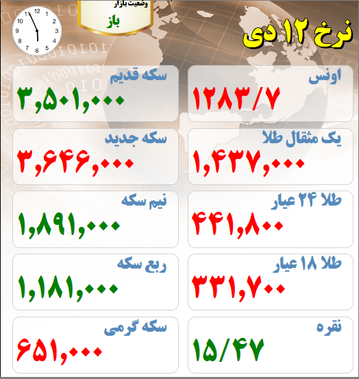 آخرین قیمت های بازار طلا و سکه دوازدهم دیماه قیمت طلا و سکه در بازار تهران تاریخ: ۱۲/دي/۹۷ ساعت ۱۷:۵۸ | اقتصاد ایران شناسه خبر: ۵۰۰۷۵ منبع: سایت طلا خبر را برای من بخوان آخرین قیمت های بازار طلا و سکه دوازدهم دیماه : (لحظه تنظیم خبر) برچسب ها : نیم سکه قیمت طلا طلا 18 عیار طلا و سکه سکه امامی